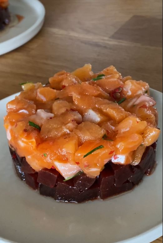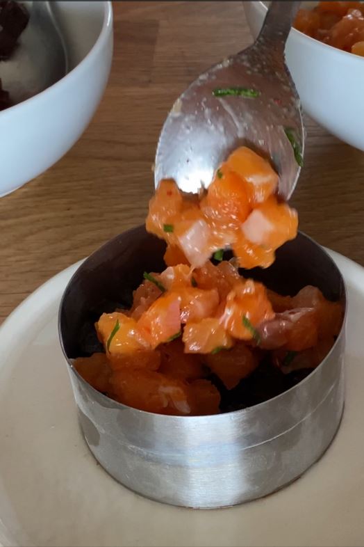 - Centrez un cercle individuel métallique dans l'assiette, disposez une couche de betteraves, puis une couche de saumon. Enlevez le cercle
