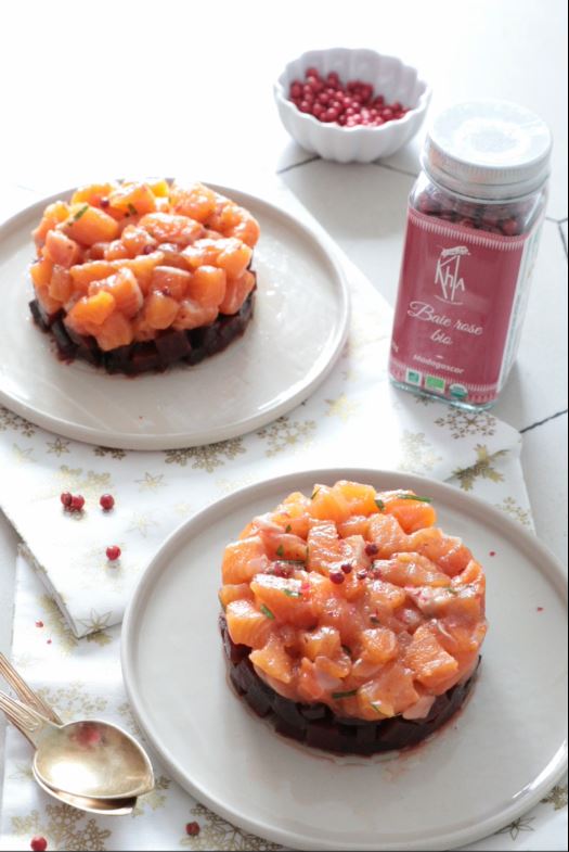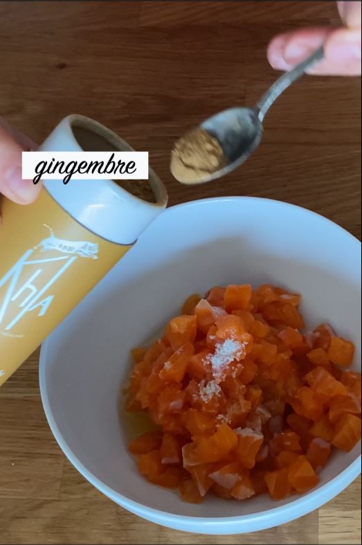 - Rajouter l'huile, le sel, le gingembre et quelques baies roses écrasées au mortier, persil et mélangez.