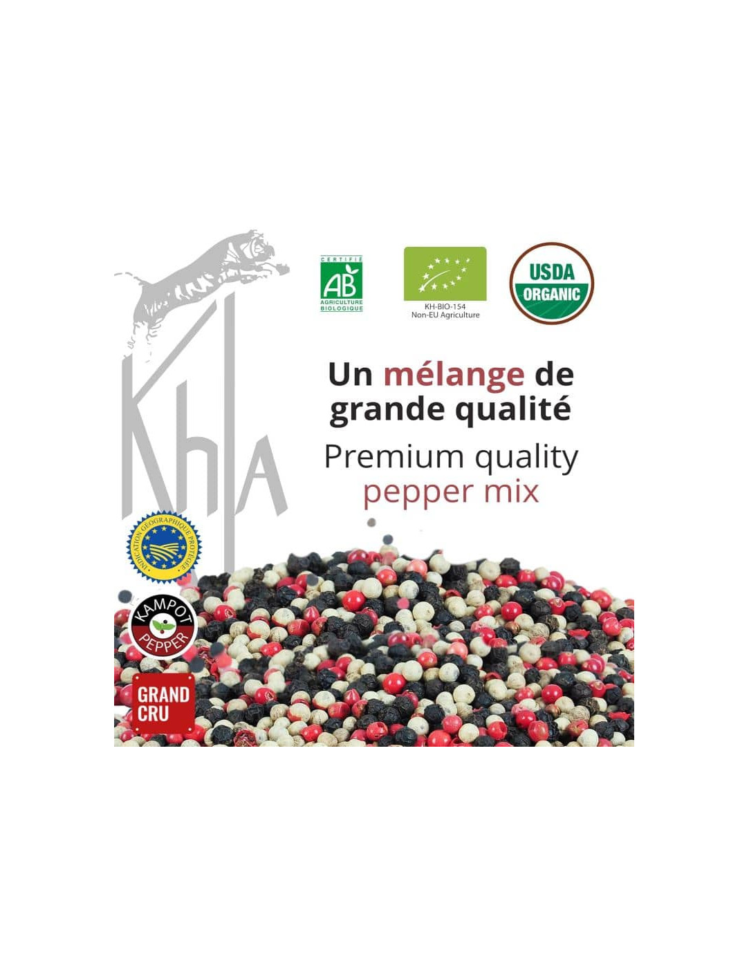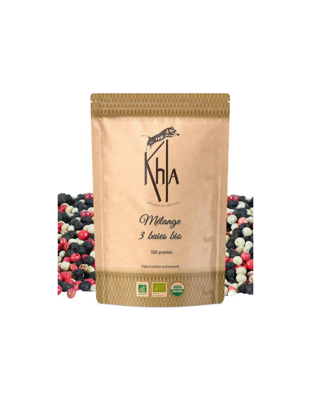 Un sac en papier-kraft recyclable contenant 500grs de mélange 3 baies biologiques : poivre noir de Kampot, baies roses de Madagascar, poivre blanc de Kampot. Baies entières, en grains.