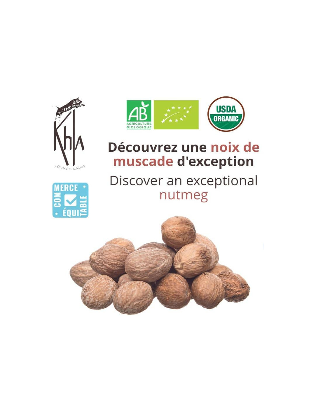 La noix de muscade entière Khla est issue de l’agriculture biologique et récoltée par de petits producteurs organisés en coopératives au Sri Lanka. Noix de muscade moulue.