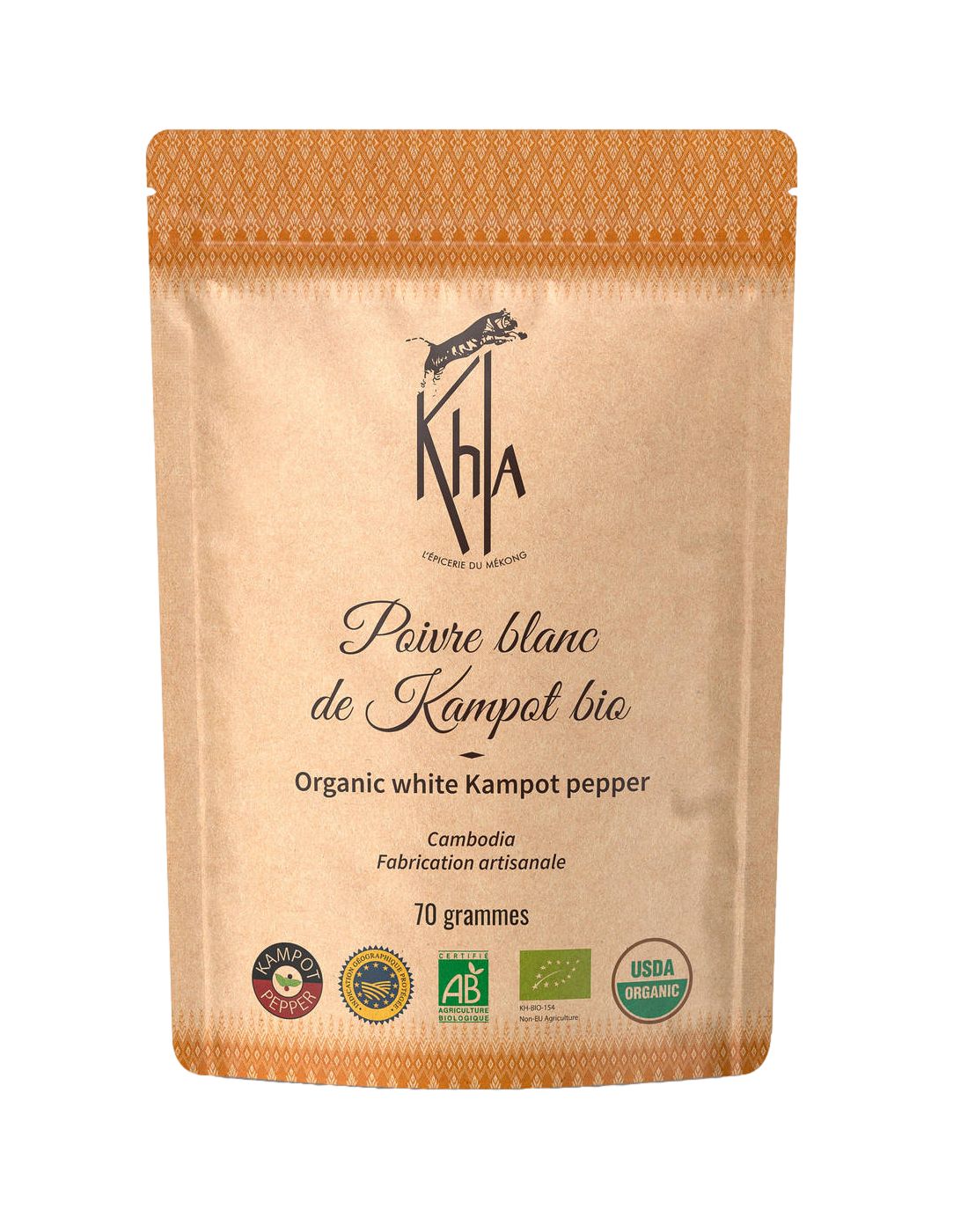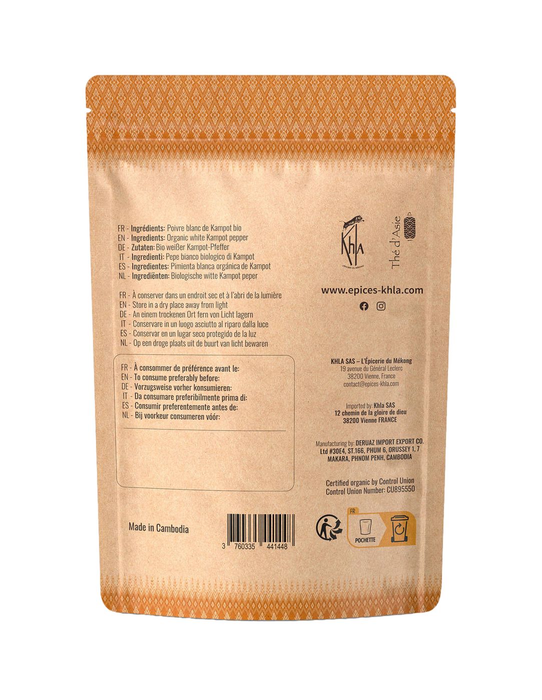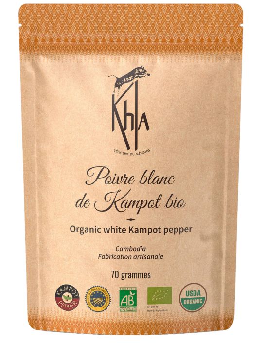 Le poivre blanc de Kampot KHLA est conditionné en grains et emballé sous-vide pour être fraichement moulu dans un moulin à poivre ou concassé au mortier et ainsi libérer toute sa saveur sur des viandes blanches, barbecue, il parfume en restant invisible dans les sauces blanches, béchamels, etc