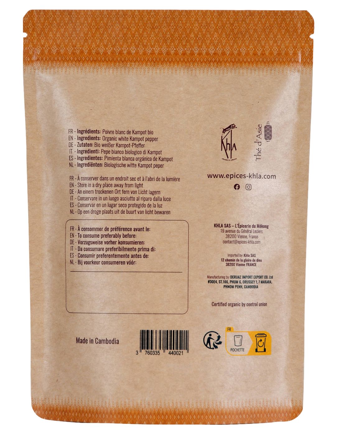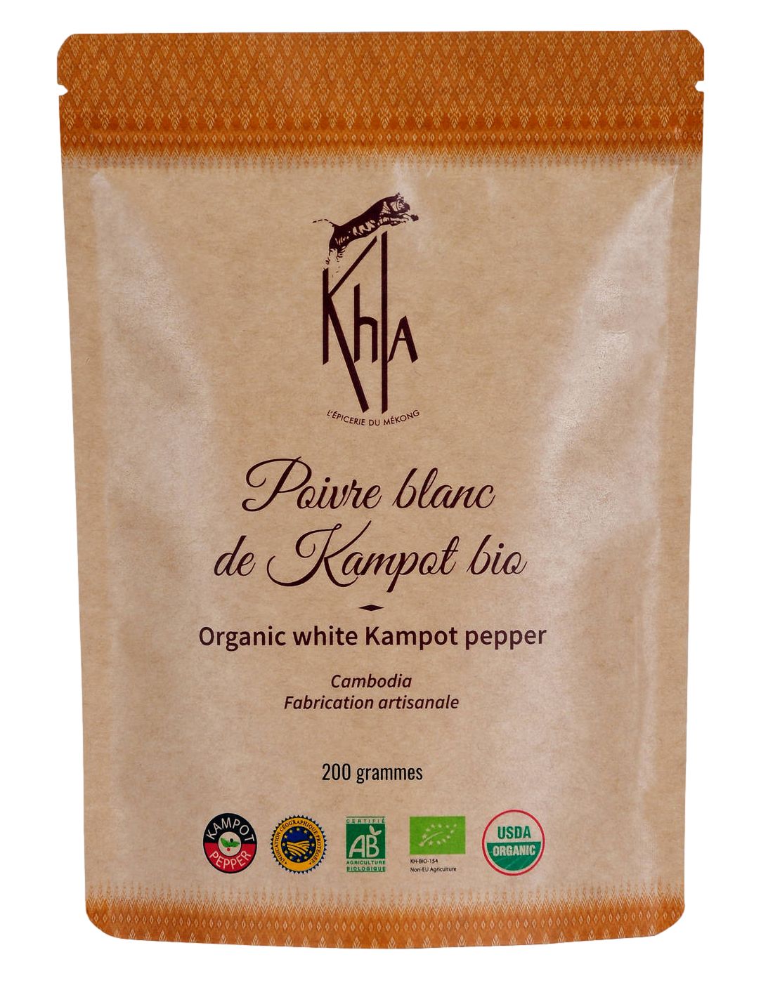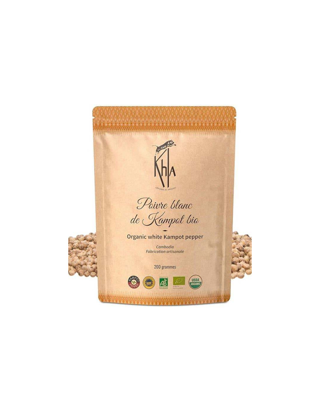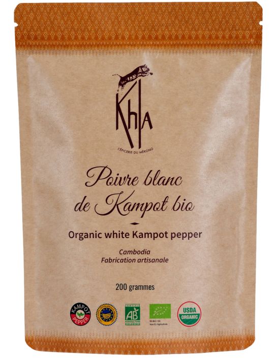 200gr de poivre blanc de Kampot en grains. Agriculture Biologique certifiée. Sachet kraft éco-responsable.