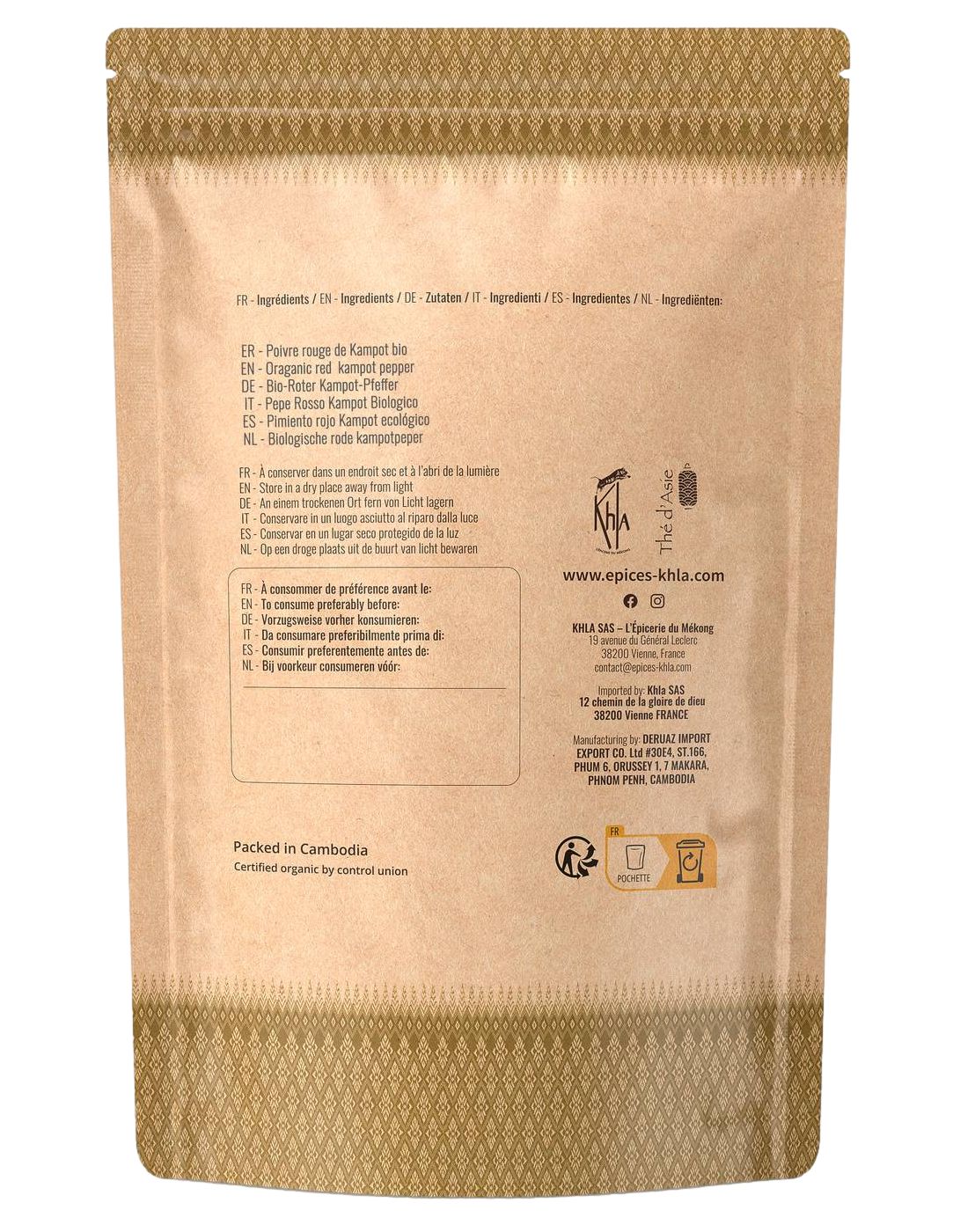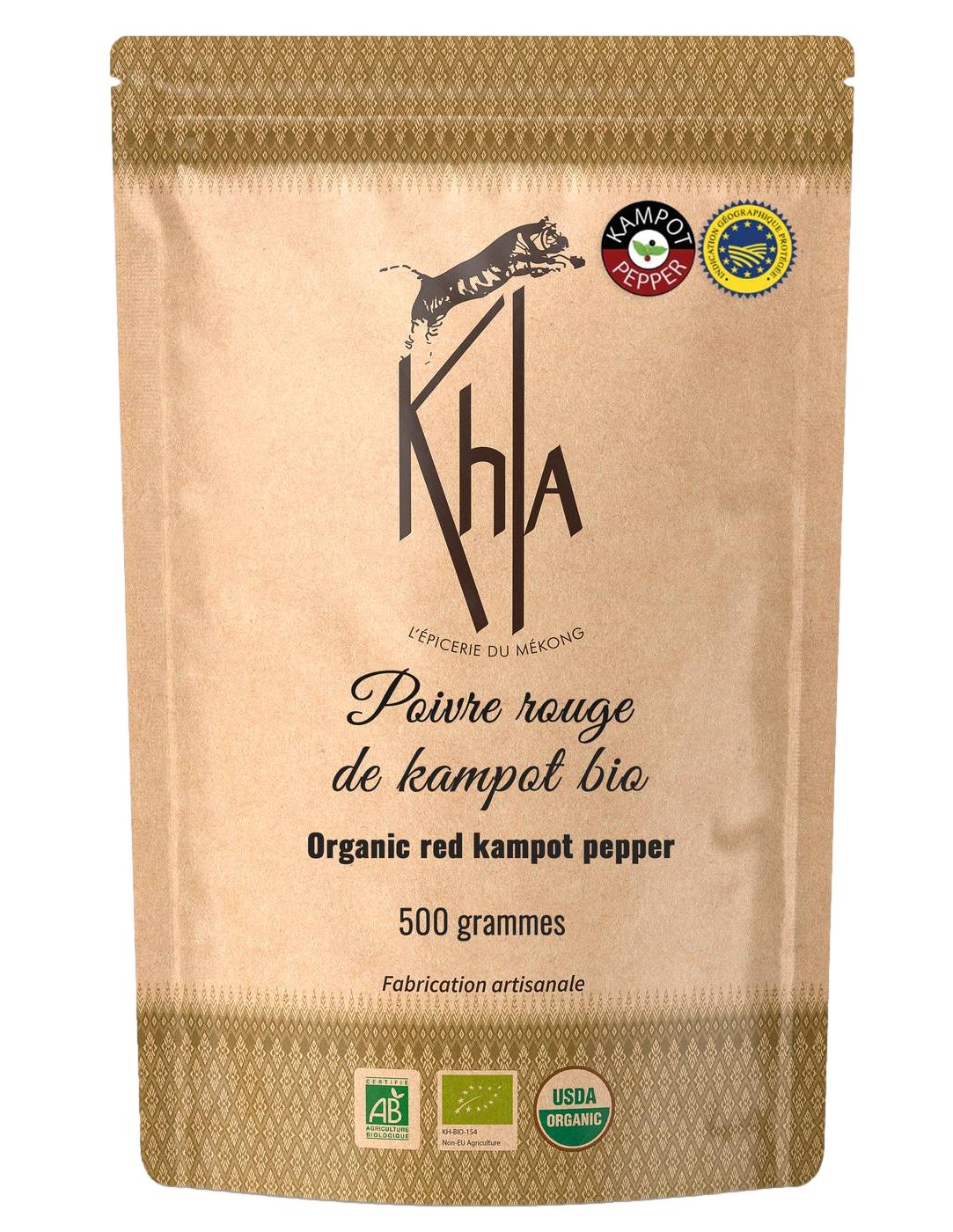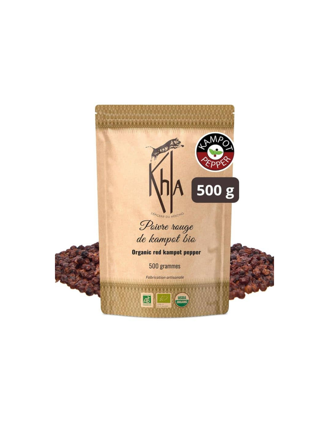 Sachet kraft recyclable et refermable contenant 500gr de poivre rouge de Kampot en grains.